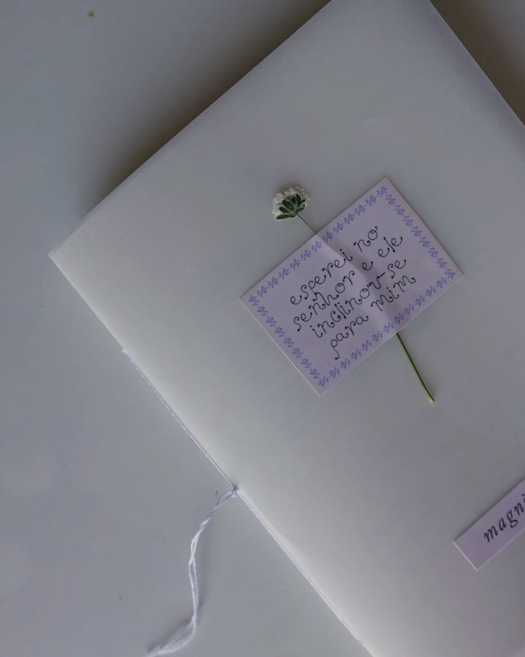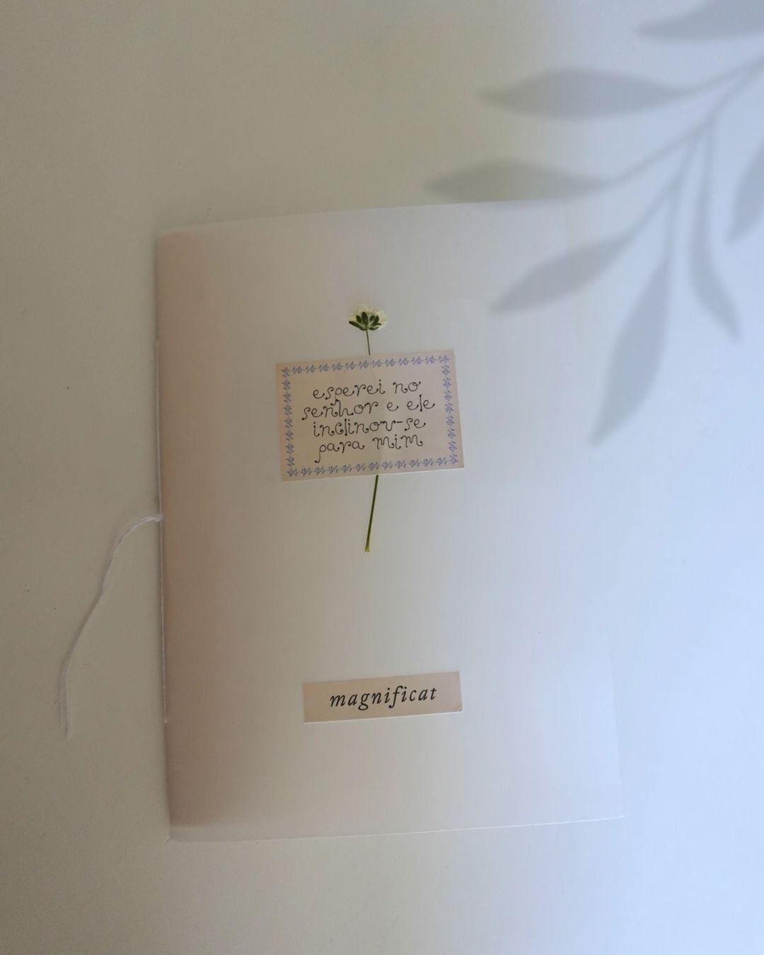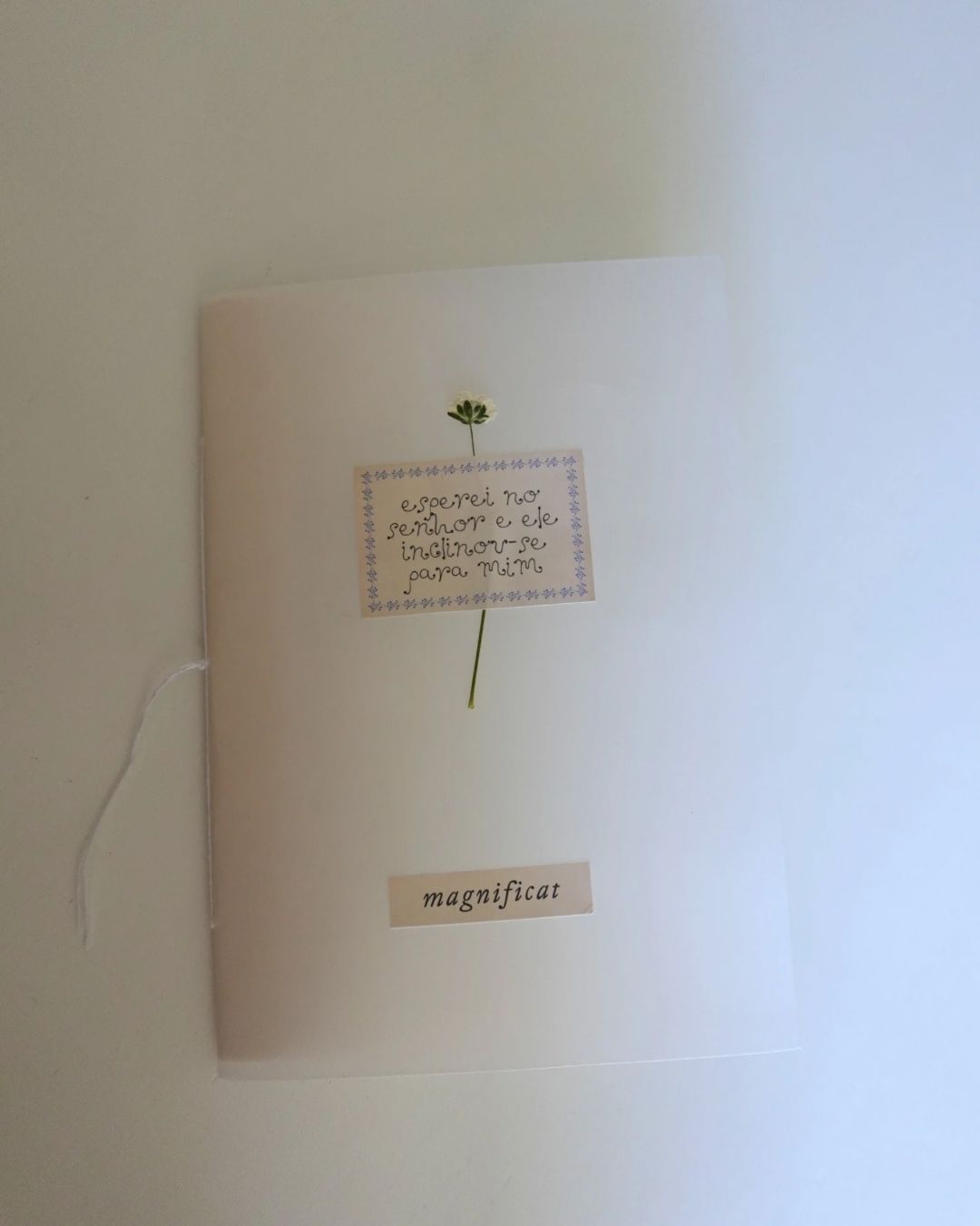 Cada livrinho é montado e cosido de forma muito simples à mão e com oração. A capa é em papel vegetal de alta gramagem cortado manualmente. Com uma flor seca pequenina.
