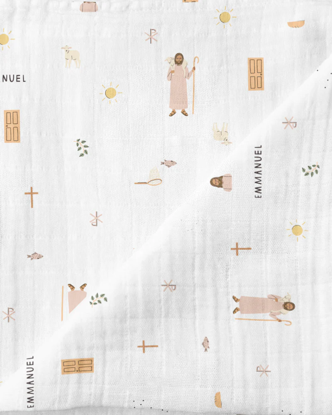 Uma fralda-mantinha de tamanho muito generoso para envolver o bebé no amor de Jesus. Feita em tecido respirável, é incrivelmente suave e perfeita para manter o bebé aconchegado. Útil em muitas situações do dia a dia.